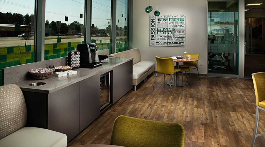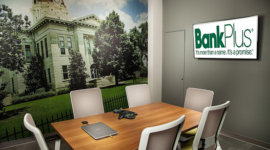General Construction services are being provided for Bank Plus to build branch offices at three different locations in Tupelo, Mississippi. Construction is complete at the West Main Street/Cliff Gookin Blvd location for this 2,744 sq ft building. Construction is currently in progress at the Barnes Crossing branch location. The rectilinear design using a combination of stone masonry veneer, fiber cement composite wall panels, aluminum composite wall panels, a generous amount of aluminum storefront and curtain wall system, and well-appointed lighting gives the bank a uniquely modern exterior look. The modern feel continues with the interior layout, finishes, and fixtures. The application of rustic hardie trim on the exterior canopy and the use of Interwoven Eco Panels on the interior feature wall add texture and warmth to this state of the art office.