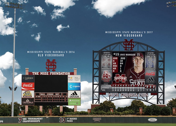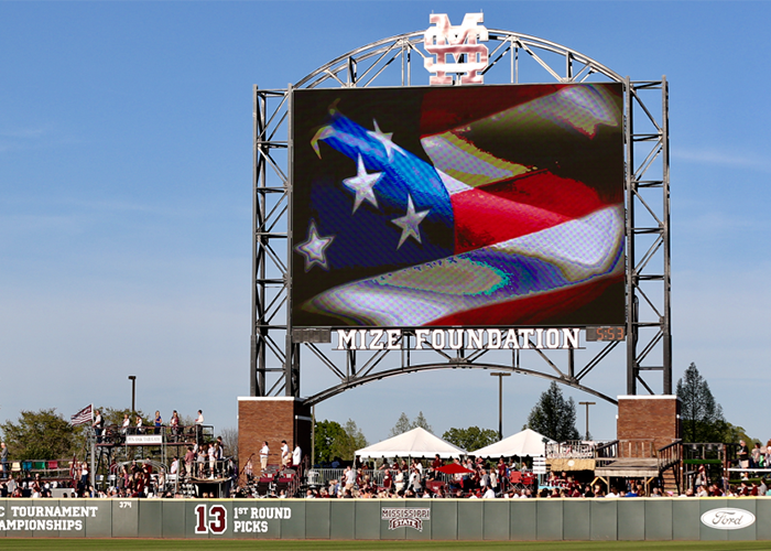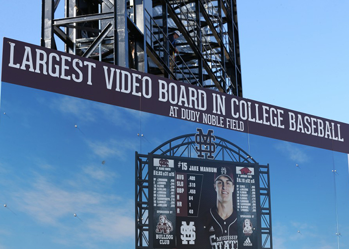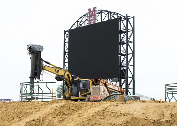 General Construction services were provided for The Bulldog Club at MSU to build what is now the largest video scoreboard on a collegiate campus in the United States. We worked alongside the design team and MSU from conception through construction, overcoming some budget issues early on and staying ahead of a tight schedule. This project consisted of approximately 100 tons of structural steel. The foundation for the scoreboard sits on drilled pilings and pile caps that are approximately 12’ wide x 17’ long and 5’ deep. We had to add to construction a brand new electrical service to feed the new video board. All construction had to be complete 4 weeks prior to the 1st pitch on February 17 so the video component could be installed. We finished approximately 2 weeks ahead of schedule, giving MSU ample time to have the videoboard ready for the 1st pitch of the season.